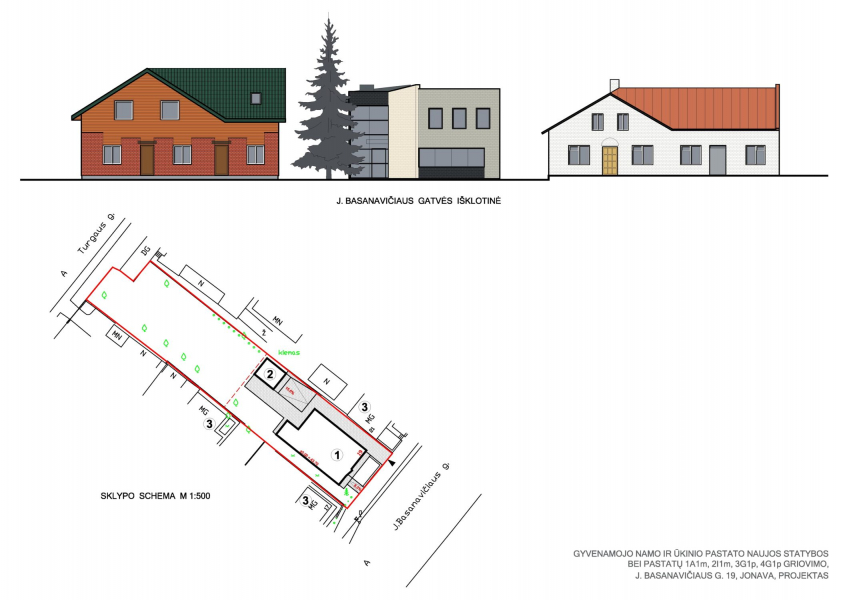 Gyvenamojo namo su komercinėmis patalpomis (iki 49%) ir ūkinio pastato naujos statybos bei pastatų 1A1m, 2I1m, 3G1p, 4G1p griovimo projektas